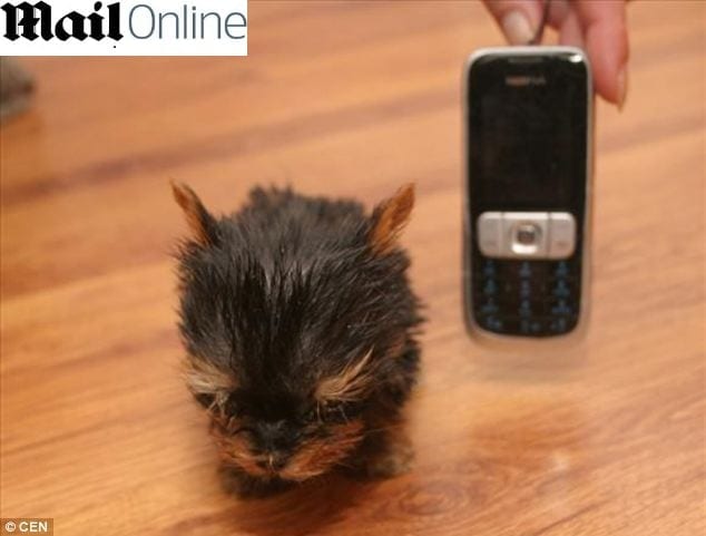 Suni nasceu com 45 gramas. Três meses depois, esta terrier minúscula chegou aos 100 gramas. Ela ainda tem 6 cm de altura, menor que o celular do dono.