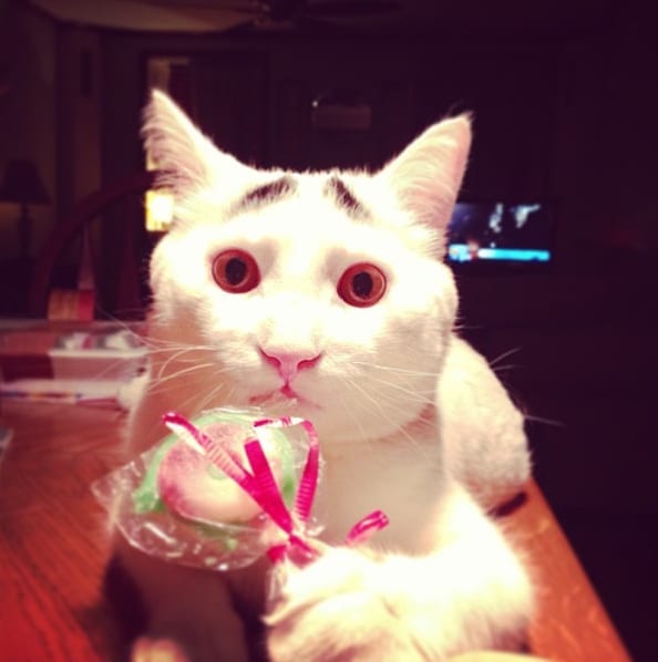 Sam é um gatinho especial, pois nasceu com sobrancelhas marcantes. Ele virou uma espécie de Malu Mader ou uma Ana Paula Arósio do mundo dos gatos.