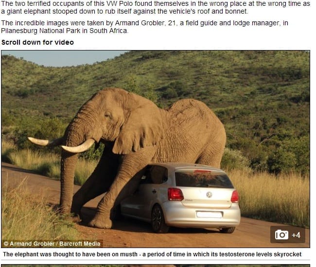 Esse lindo elefante do Parque Nacional de Pilanesberg, na ífrica do Sul, resolveu usar um carro com turistas para dar uma coçadinha.