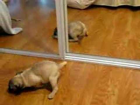 Filhote de pug fica intrigado com espelho: "Quem está lá?"