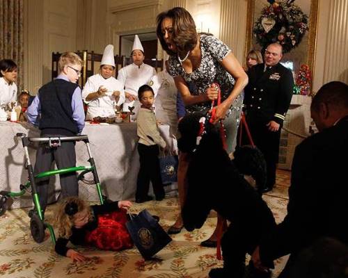 Sunny, a cachorrinha irmã de Bo, o outro cão do presidente dos EUA, derrubou uma menininha fofa, na hora da brincadeira.
